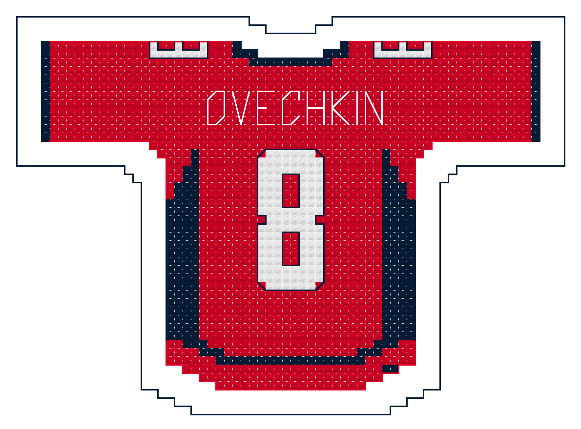 The size of the jersey alone is 60 squares wide by 42 squares high. Physical size will depend on the “count” of the Aida cloth or size specifications of the medium you choose.