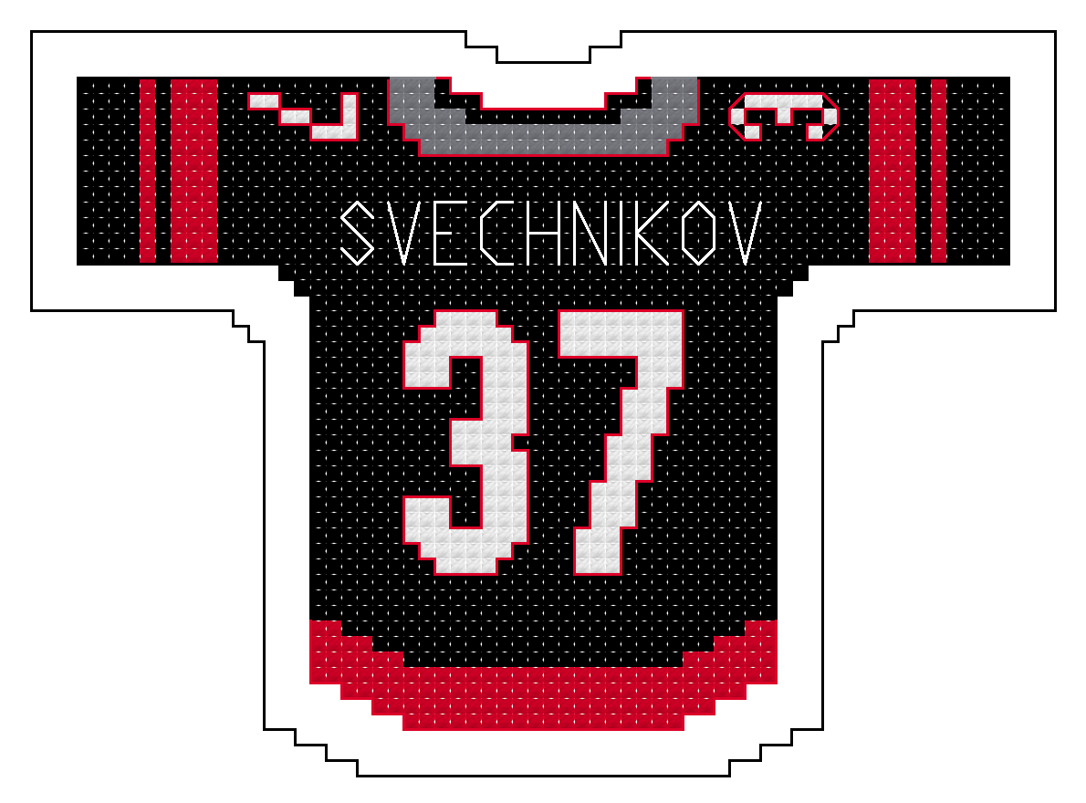 The size of the jersey alone is 60 squares wide by 42 squares high. Physical size will depend on the “count” of the Aida cloth or size specifications of the medium you choose.