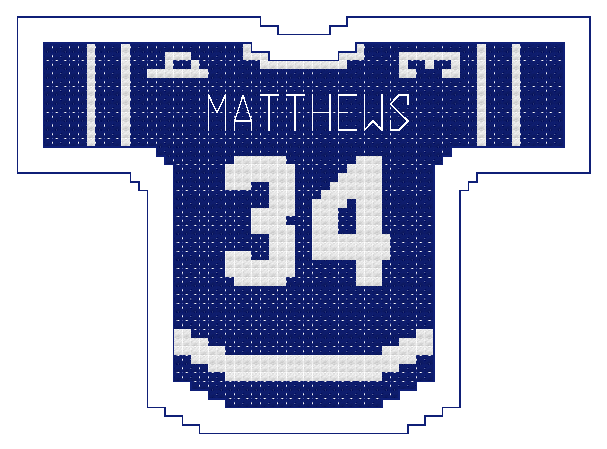 The size of the jersey alone is 60 squares wide by 42 squares high. Physical size will depend on the “count” of the Aida cloth or size specifications of the medium you choose.