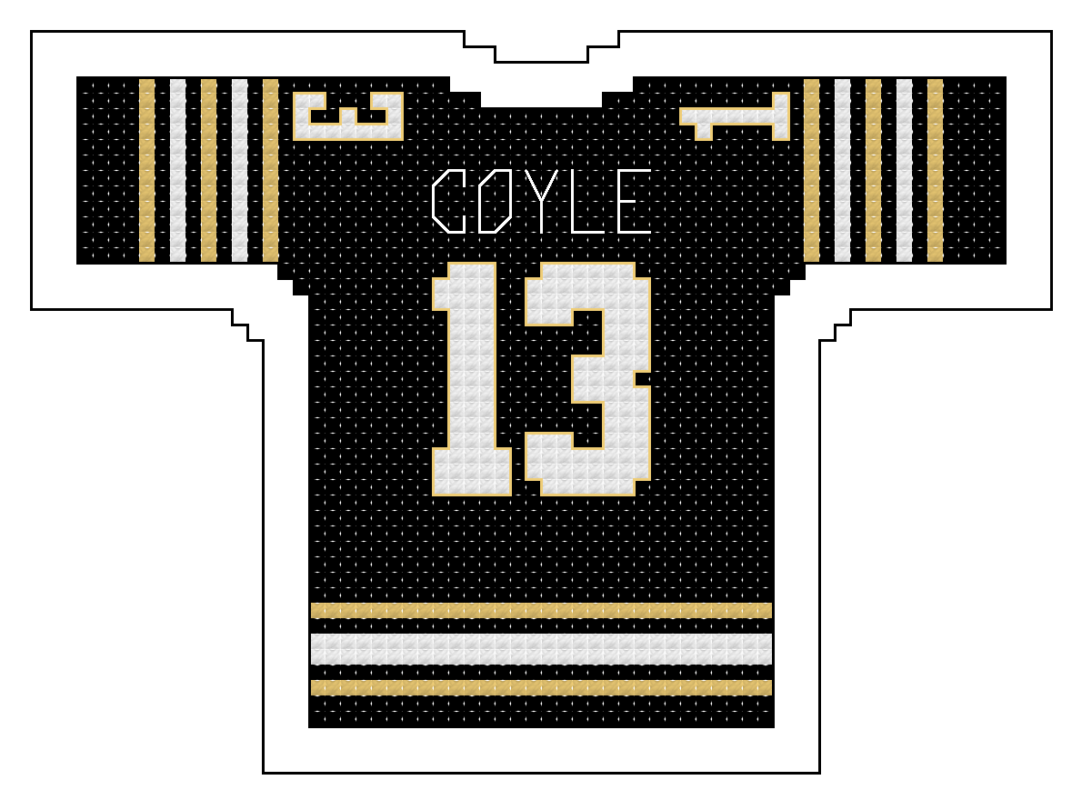 The size of the jersey alone is 60 squares wide by 42 squares high. Physical size will depend on the “count” of the Aida cloth or size specifications of the medium you choose.