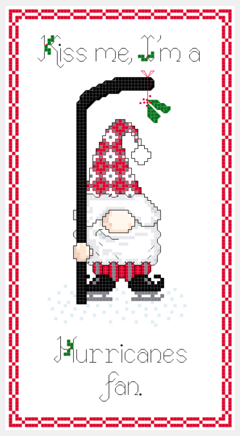 This is a cross stitch pattern for a hockey gnome sampler that says “Kiss Me, I’m a Hurricanes fan.” featuring a gnome in team colors and holding a hockey stick with mistletoe dangling from the blade.