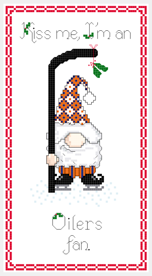 This is a cross stitch pattern for a hockey gnome sampler that says “Kiss Me, I’m an Oilers fan.” featuring a gnome in team colors and holding a hockey stick with mistletoe dangling from the blade.