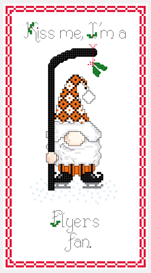This is a cross stitch pattern for a hockey gnome sampler that says “Kiss Me, I’m a Flyers fan.” featuring a gnome in team colors and holding a hockey stick with mistletoe dangling from the blade.
