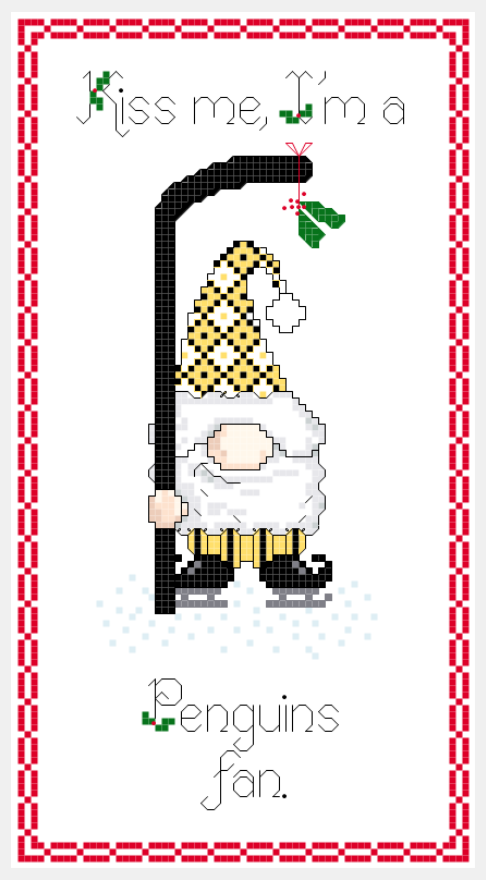 This is a cross stitch pattern for a hockey gnome sampler that says “Kiss Me, I’m a Penguins fan.” featuring a gnome in team colors and holding a hockey stick with mistletoe dangling from the blade.