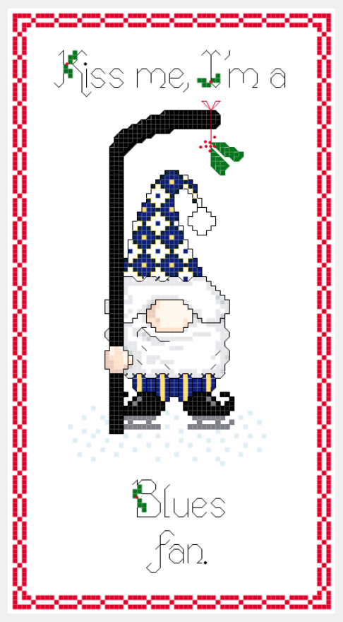 This is a cross stitch pattern for a hockey gnome sampler that says “Kiss Me, I’m a Blues fan.” featuring a gnome in team colors and holding a hockey stick with mistletoe dangling from the blade.