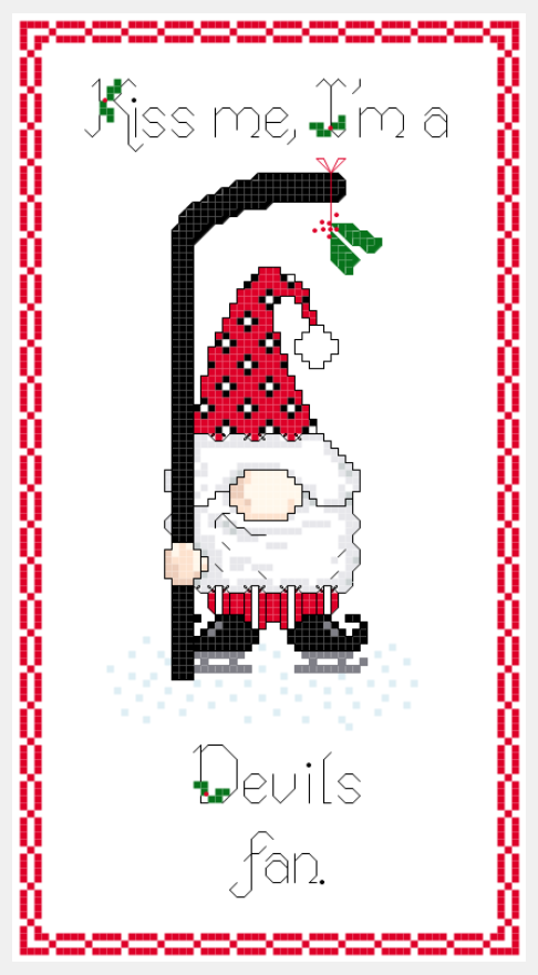This is a cross stitch pattern for a hockey gnome sampler that says “Kiss Me, I’m a Devils fan.” featuring a gnome in team colors and holding a hockey stick with mistletoe dangling from the blade.