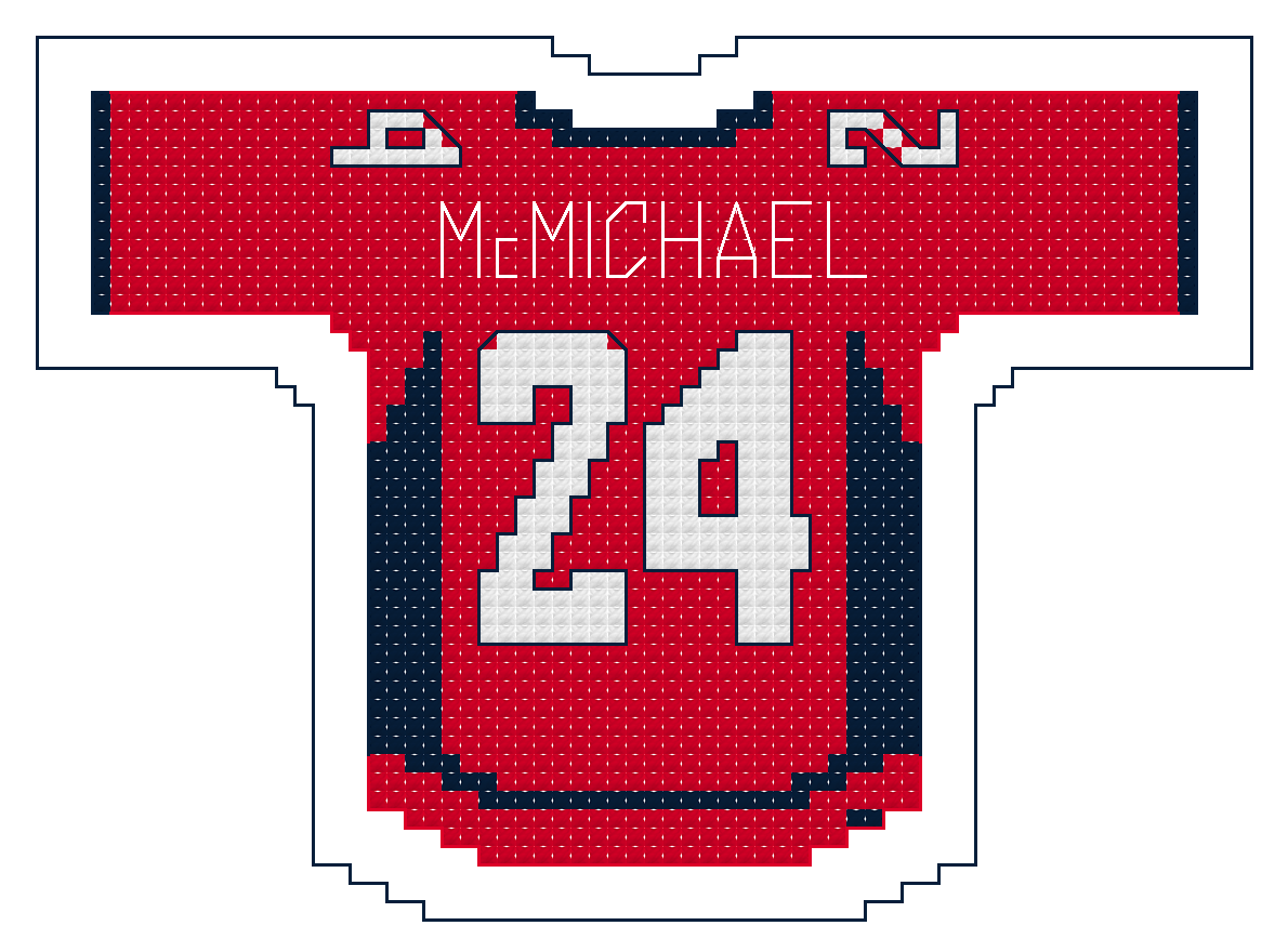 The size of the jersey alone is 60 squares wide by 42 squares high. Physical size will depend on the “count” of the Aida cloth or size specifications of the medium you choose.