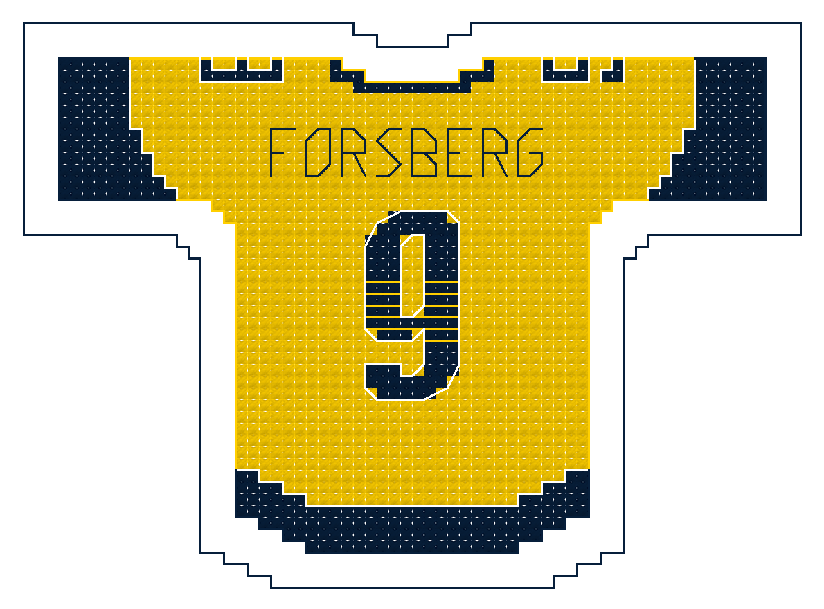 The size of the jersey alone is 60 squares wide by 42 squares high. Physical size will depend on the “count” of the Aida cloth or size specifications of the medium you choose.