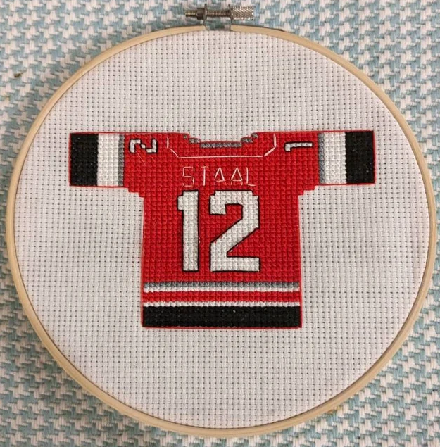The size of the jersey alone is 60 squares wide by 42 squares high. Physical size will depend on the “count” of the Aida cloth or size specifications of the medium you choose.
