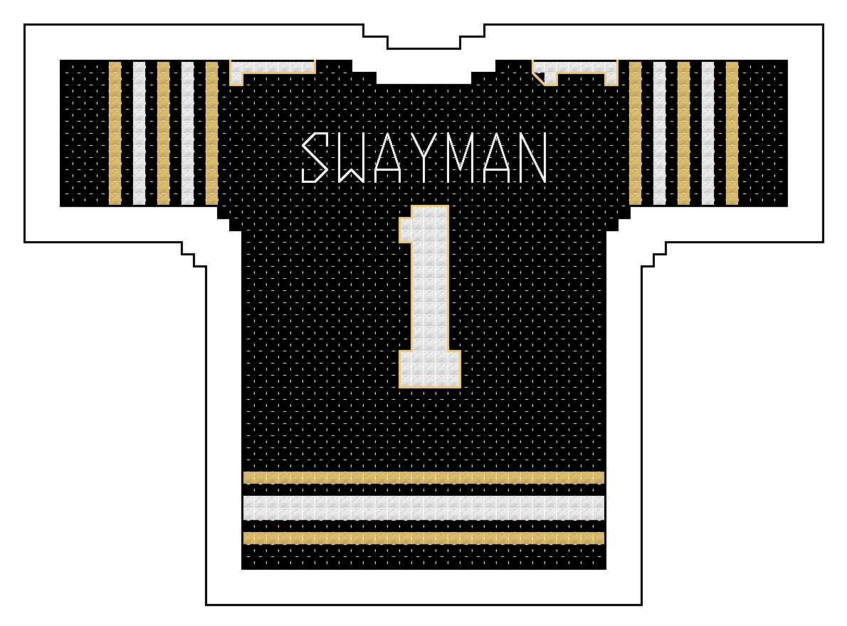 The size of the jersey alone is 60 squares wide by 42 squares high. Physical size will depend on the “count” of the Aida cloth or size specifications of the medium you choose.