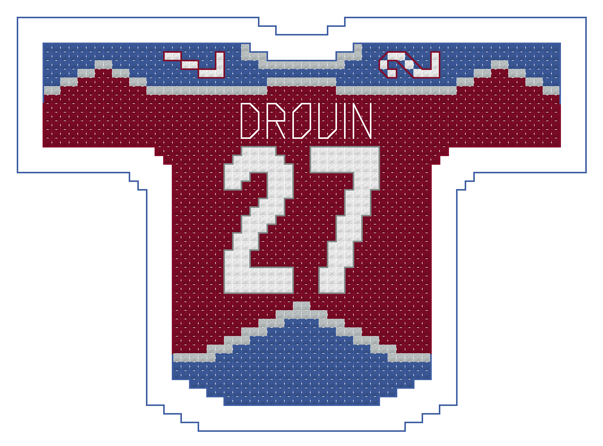 The size of the jersey alone is 60 squares wide by 42 squares high. Physical size will depend on the “count” of the Aida cloth or size specifications of the medium you choose.