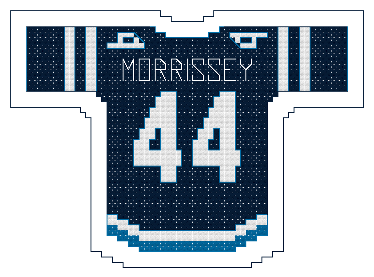 The size of the jersey alone is 60 squares wide by 42 squares high. Physical size will depend on the “count” of the Aida cloth or size specifications of the medium you choose.