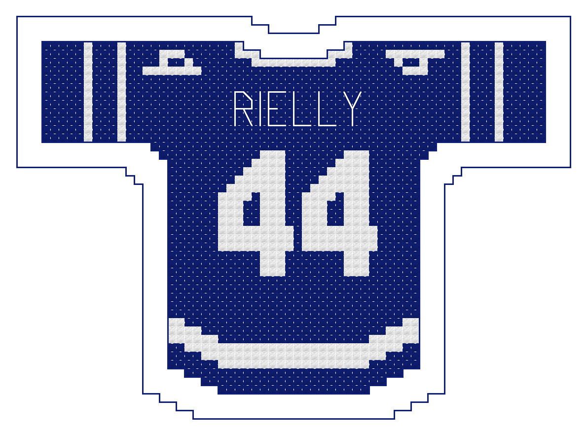 The size of the jersey alone is 60 squares wide by 42 squares high. Physical size will depend on the “count” of the Aida cloth or size specifications of the medium you choose.