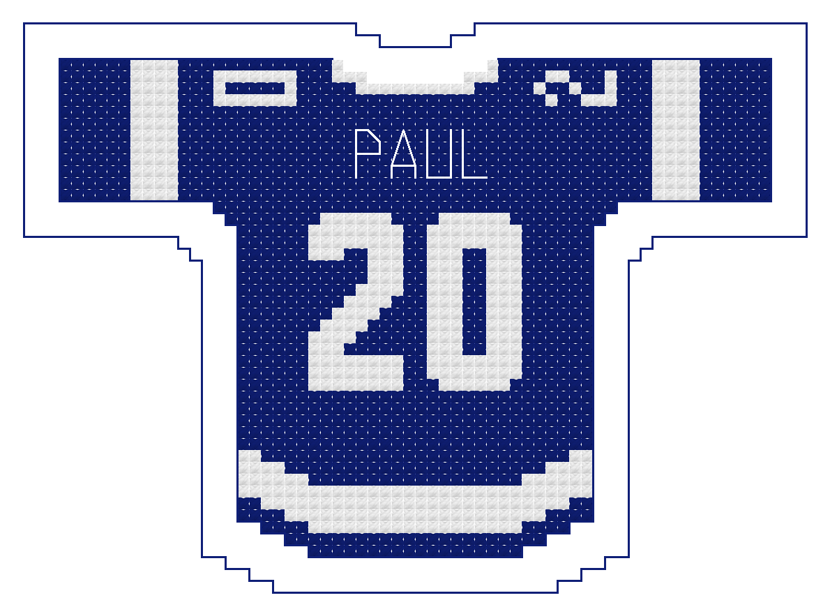 The size of the jersey alone is 60 squares wide by 42 squares high. Physical size will depend on the “count” of the Aida cloth or size specifications of the medium you choose.