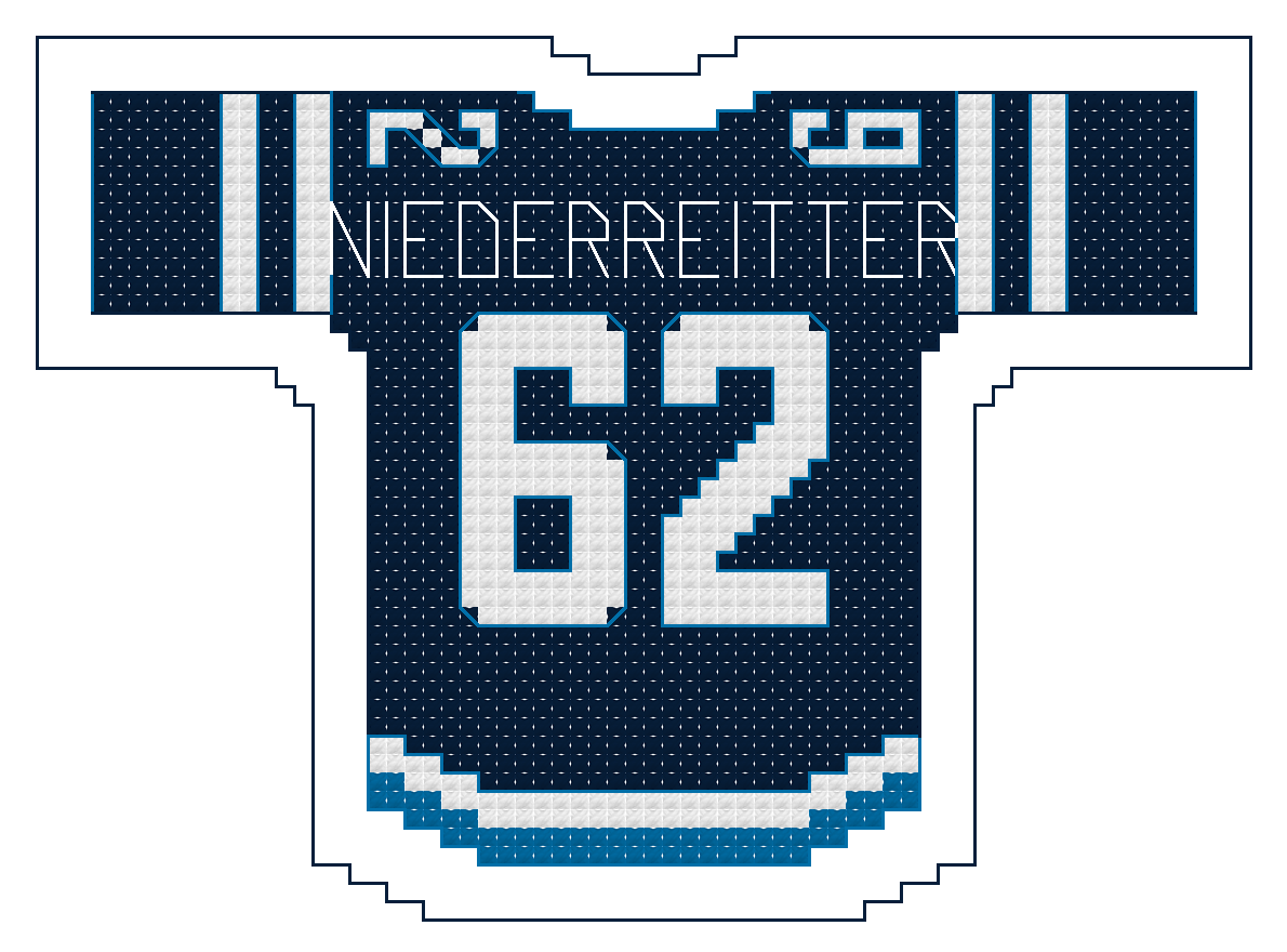The size of the jersey alone is 60 squares wide by 42 squares high. Physical size will depend on the “count” of the Aida cloth or size specifications of the medium you choose.