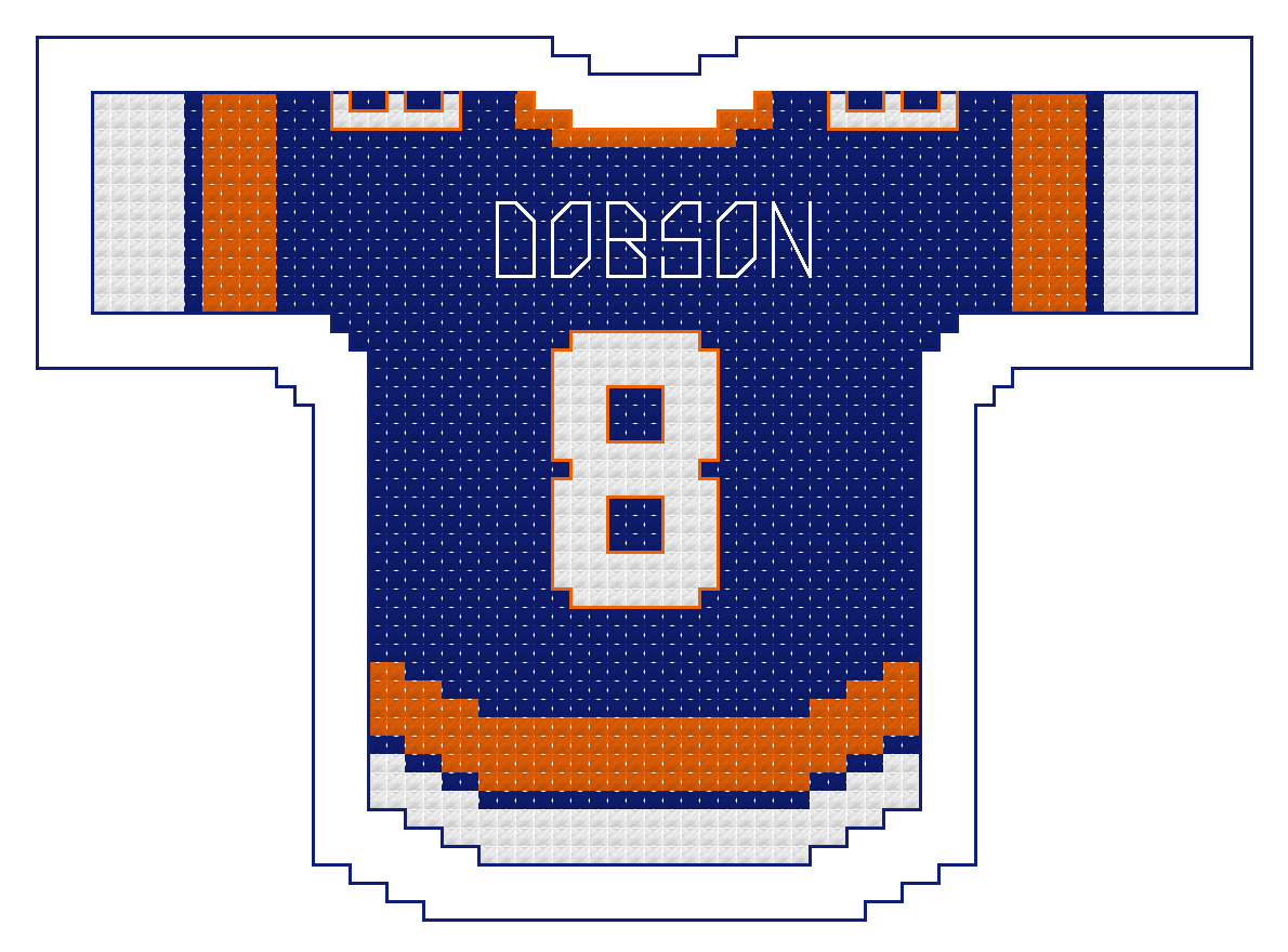 The size of the jersey alone is 60 squares wide by 42 squares high. Physical size will depend on the “count” of the Aida cloth or size specifications of the medium you choose.
