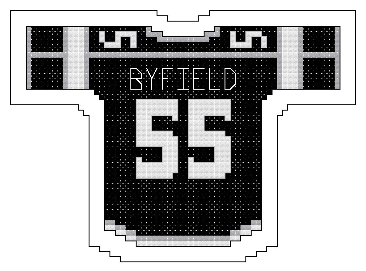 The size of the jersey alone is 60 squares wide by 42 squares high. Physical size will depend on the “count” of the Aida cloth or size specifications of the medium you choose.