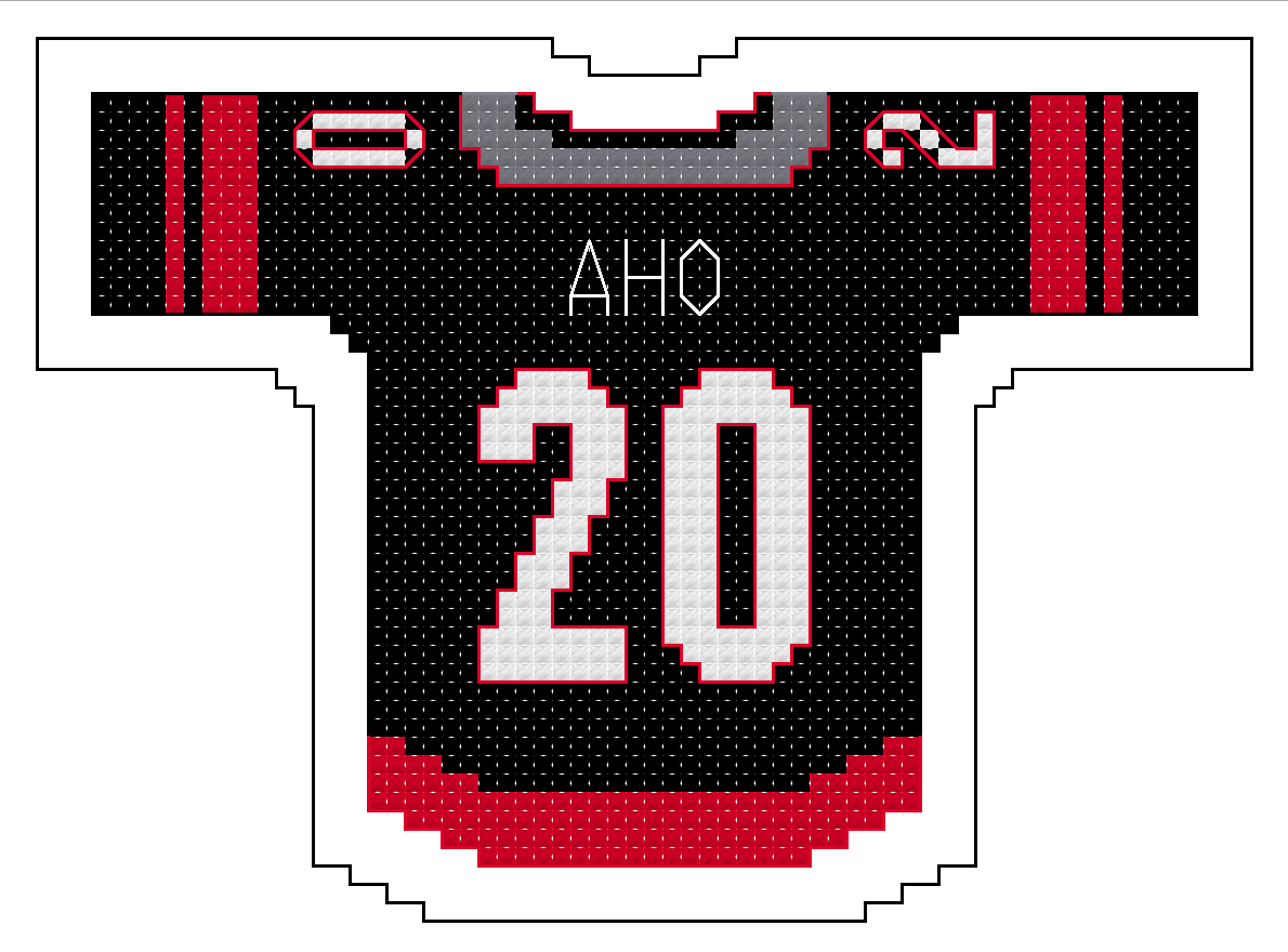 The size of the jersey alone is 60 squares wide by 42 squares high. Physical size will depend on the “count” of the Aida cloth or size specifications of the medium you choose.