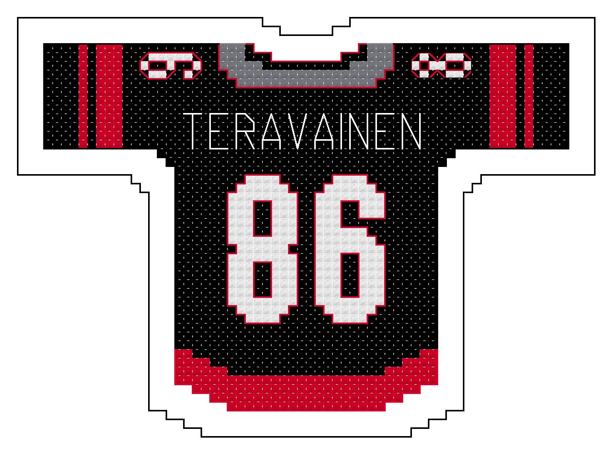 The size of the jersey alone is 60 squares wide by 42 squares high. Physical size will depend on the “count” of the Aida cloth or size specifications of the medium you choose.